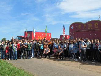 Lehrern zu Fuß Richtung Göttschied in Bewegung. Dort gastiert seit einigen Tagen der Zirkus Meik der Familie Lauenburger. Orientierungsstufenleiter Jan Schwab hatte für alle sechsten und siebten Klassen der Heinzenwies eine morgendliche Sondervorstellung organisiert und so fragte Zirkuschefin Vanessa Lauenburger pünktlich um zehn Uhr: „Seid ihr bereit?“ Im Zirkuszelt folgten in rascher Abfolge Akrobatiknummern, ein „Einhorn“ ritt durch die Manege und Stühle wurden allein auf dem Kinn eines Akrobaten balanciert. In der Pause zog der Streicheltierzoo hinter dem Zirkuszelt die Schüler an. Nach der Pause faszinierte ein Feuerschlucker die Heinzenwiesler mit seinen Kunststücken. Versorgt mit bunten Lollis und Tröten ging es nach einem gemeinsamen Foto mit allen Artisten und Schülern wieder zurück Richtung Heinzenwies. Unterwegs war die Stimmung so gut, dass sogar gemeinsam gesungen wurde. „Ein wunderschöner Ausflug“, so waren sich am Ende alle einig.