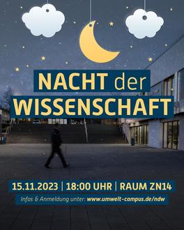 Anmeldungen bitte bis zum 06.11.2023 über das Formular unter www.umwelt-campus.de/ndw oder per E-Mail mit Angabe von Name und Funktion der teilnehmenden Personen unter nachtderwissenschaft@umwelt-campus.de.