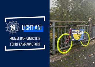Bei der Kampagne „LICHT AN!“ werden alte, unbrauchbare Fahrräder aus dem Fundbüro der Stadt Idar-Oberstein mit Signalfarbe besprüht und im gesamten Stadtgebiet am Fahrbahnrand aufgestellt. Die Fahrräder sollen dabei in der Dunklen Jahreszeit auf die Beleuchtung und Sichtbarkeit im Straßenverkehr hinweisen.