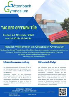 Das Göttenbach-Gymnasium öffnet am 24. November 2023 ab 14:30 Uhr seine Türen für einen aufregenden Tag der offenen Tür. Wir laden alle Eltern, Schülerinnen und Schüler, sowie Interessierte herzlich dazu ein, uns zu besuchen und unsere Schule näher kennenzulernen. Erfahren Sie, was unsere Schule besonders macht: Von inspirierendem Unterricht über vielfältige Arbeitsgemeinschaften bis hin zu einem Ganztagesangebot und modernster Ausstattung - bei uns ist für jeden etwas dabei!