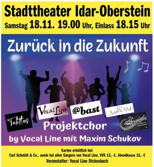 Auch wir sind am 18.11.2023 dabei wenn es im Stadttheater zurück in die Zukunft heißt. Mit einem, eigens für dieses Konzert entstandenen Projektchor ist der Chor Vocal Line Dickesbach Ausrichter im Stadttheater Idar-Oberstein. Alle Teilnehmer freuen sich auf den 18.11.2023. Endlich ist es wieder möglich, Veranstaltungen dieser Art mit aufwendiger Licht- und Tontechnik und Moderation wie vor der Pandemie, durchzuführen.