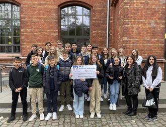 Am 7. November war es dann endlich soweit. Gemeinsam mit den Lehrerinnen Katrin Luthmann und Nadine Agné-Riedel ging es morgens ins Kulturzentrum nach Mainz, wo alle Finalteilnehmer nach dem Prinzip der bekannten Quizsendung „Wer wird Millionär?“ 15 Fragen zu „ihrem“ Buch beantworten mussten. Für die 8b der Heinzenwies stiegen Lilith Gutendorf und Carolina Wagner aufs Podium, um sich souverän den Fragen des Moderators Martin Tietjen zu stellen. Carolina und Lilith schafften es tatsächlich, den Höchstbetrag von 500 Euro für die Klassenkasse zu erspielen! Ministerin Katharina Binz überreichte ihnen einen Scheck, den die beiden freudestrahlend in Empfang nahmen.