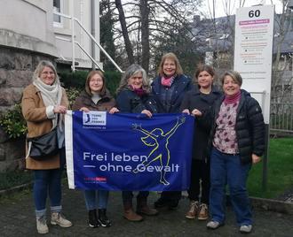 beteiligen sich an Fahnenaktion "Frei leben - ohne Gewalt" zum Internationalen Tag gegen Gewalt an Frauen am 25. November