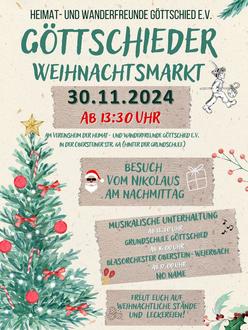 Am Samstag, dem 30. November 2024, findet der Göttschieder Weihnachtsmarkt statt. Ab 13:30 Uhr laden die Heimat- und Wanderfreunde an das Vereinsheim in der Obersteiner Straße 6a ein.