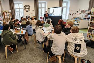Nachmittags leitete Nils Oskamp für einen Teil unserer Schülerinnen und Schüler einen Comic- und Cartoonworkshop in der Stadtbücherei. Mit seiner Unterstützung zeichneten die Jugendlichen ihre eigenen Comics zum Thema "Argumentation gegen Rechtsextremismus / Antisemitismus / Rassismus".