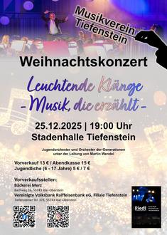 Frisch ausgezeichnet mit dem Kulturpreis 2025 der Stadt Idar-Oberstein präsentieren unsere beiden Orchester, unter der musikalischen Leitung von Martin Wendel, am 25.12.2025 ab 19:00 Uhr in der Stadenhalle Tiefenstein eine vielseitige Mischung aus Filmmusik, Originalkompositionen und Stücke aus verschiedenen Genres. Unter dem Motto „Leuchtende Klänge – Musik, die erzählt“ erwartet die Besucher ein atmosphärischer Abend voller Emotionen und Vielfalt. Ein stimmungsvolles Lichtkonzept wird zudem für besonders „leuchtende“ Momente sorgen.