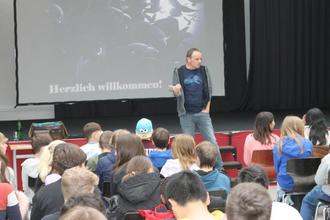 Wer setzt schon seiner Deutschlehrerin ein Denkmal? Der erfolgreiche Schriftsteller, Performer und Weltrekordinitiator in Sachen (Vor-) Lesen tut genau das. Bei seiner Lesung am Gymnasium an der Heinzenwies berichtete er nämlich der verwunderten Stufe 6, wie er sich vom Nichtleser und Fünferkandidaten in Deutsch zum erfolgreichen Kinder- und Jugenbuchautor entwickelte. Besagte Lehrerin „schmiss“ nämlich während ihres Deutschunterrichtes diverse Bücher den Schülern entgegen, von denen sie hoffte, das Interesse und nicht den Adressaten zu treffen. Bei Stefan Gemmel war wohl Ersteres ein voller Erfolg.