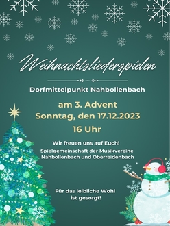 Die Spielgemeinschaft der Musikvereine Nahbollenbach und Oberreidenbach lädt ein zum traditionellen Weihnachtsliederspielen im Dorfmittelpunkt Nahbollenbach. Da der vierte Advent dieses Jahr auf Heiligabend fällt, findet die Veranstaltung bereits am dritten Advent statt.