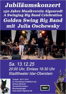 Die „Mutter“ der Bigband, der Musikverein Algenrodt, existiert seit 150 Jahren. Um dieses Jubiläum zu feiern, veranstaltet die Band ein Konzert mit einem besonderen Programm mit besonderen Musiktiteln. „Es werden keine Grußworte oder Reden gehalten“, verspricht Bandleader Uwe Kirsch. Ein mitreißendes Programm wird das Publikum vom ersten bis zum letzten Titel mitnehmen. Julia Oschewsky, die sympathische Sängerin aus Bingen wird mit Songs wie MAMBO ITALIANO, IT HAD BETTER BE TONIGHT, UNFORGETTABLE, SEND IN THE CLOWNS die Zuhörer in ihren Bann ziehen.