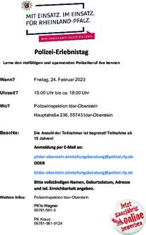 Am Freitag, den 24. Februar 2023, von 15 bis 18 Uhr, bietet die Polizei- und Kriminalinspektion Idar-Oberstein einen Polizei-Erlebnistag auf dem Gelände der selbigen Polizeiinspektion, in der Hauptstraße 236 in 55743 Idar-Oberstein, an.