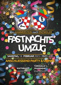 Endlich ist es wieder soweit. Durch die beiden Stadteile Hammerstein und Enzweiler wird sich wieder ein Fastnachtsumzug auf den Weg machen. Starten wird der närrische Lindwurm am Samstag, 18.112023 um 15:11 Uhr in Hammerstein. Vorbei am Kulturhaus Richtung Ortsausgang. Neu aufgestellt in Enzweiler, zieht man dann durch die Enzweiler Straße vorbei am Buswendeplatz. Nach dem Umzug kann in der Mehrzweckhalle Enzweiler und im Kulturhaus Hammerstein noch weiter gefeiert werden.