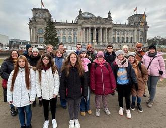 Unter dem Motto Spurensuche Demokratie machten sich die Jugendlichen auf den Weg nach Berlin. Auf dem Programm standen ein Besuch des Reichstagsgebäudes mit Besichtigung des Bundestages, der Ausstellung Topographie des Terrors, des Olympiastadions und der Anne Frank Ausstellung. Beim Stadtrundgang lauschten die Jugendlichen trotz eisiger Kälte den Ausführungen von Dennis Behnke, dem Berliner Geschichtenerzähler.