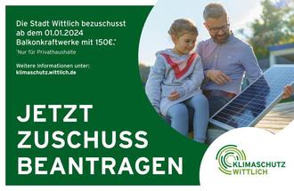 Seit dem 1. Januar 2024 können Zuschussanträge für die Förderung von Balkonkraftwerke gestellt werden. Alle Informationen hierzu finden Sie unter www.klimaschutz.wittlich.de.