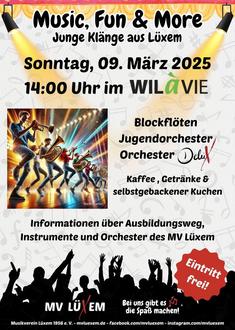 Am Sonntag, 9. März 2025 lädt der Musikverein Lüxem zu einem besonderen musikalischen Nachmittag ein! Unter dem Motto „Music, Fun & More - Junge Klänge aus Lüxem“ präsentieren die Nachwuchsorchester des MV Lüxem ihr Können.