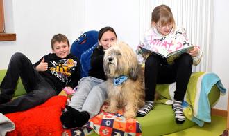 Spaß beim Vorlesen: die erste Lesehund-Gruppe mit ihrem vierbeinigen Zuhörer.