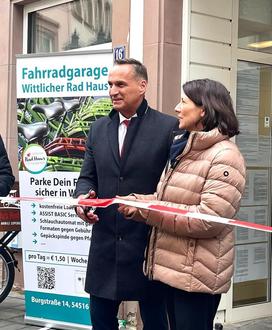 Verkehrsministerin Daniela Schmitt und Bürgermeister Joachim Rodenkirch schneiden das Band durch und eröffnen das Rad Haus in Wittlich.