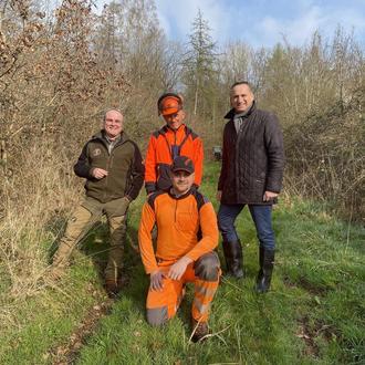 Bürgermeister Joachim Rodenkirch besuchte die Forstwirte Rolf Weber (Stehend Mitte) und André Pelm (vorne Knieend) und den Revierförster Mario Sprünker (links) am Tag des Waldes (Foto: Martin Becker).