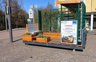 Nach dem Winterschlaf am Kurfürstenplatz und seiner feierlichen Übergabe im Dezember durfte das Grüne Zimmer weiterziehen. Bis es in voller Begrünung steht und umfangreich Schatten spenden kann, werden noch ein paar Monate vergehen. Mit frischer Frühjahresbepflanzung bietet es jedoch jetzt schon allen Besuchern eine einladende Möglichkeit zum Verweilen an. Neben den vorhandenen Sitzplätzen gibt es noch weitere Funktionen, die es zu entdecken gibt.