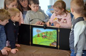 Die Meerfelder „Maarwichtel“ hatten sich für eine ganz andere Geschichte entschieden: mit farbenfroh gestalteten Kamishibai-Karten erzählten sie das Buch „Wo Drachen wachen“ als japanisches Erzähltheater nach. Gespannt verfolgten die Zuschauer die lustige Geschichte, in der ein kurzsichtiger Ritter auf Drachenjagd geht und dem Objekt seiner Begierde in jeder Szene ganz nahe ist, ohne es zu merken.