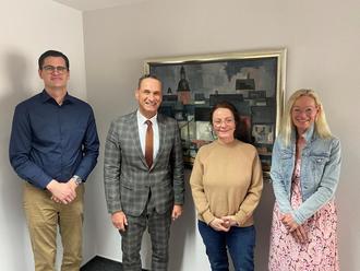 Bürgermeister Joachim Rodenkirch gratulierte Hildegard Dahl (2. v. r.) zum 25-jährigen Dienstjubiläum. Der Gratulation schloss sich der Sachgebietsleiter Michael Schmitt (1. v. l.) sowie die stellvertretende Personalratsvorsitzende Petra Hoffmann (1. v. r.) gerne an. (Foto: Sebastian Klein).