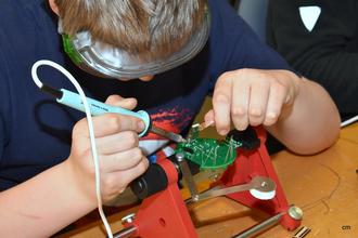 In den Osterferien fanden mehrere Workshops im Makerspace für Kinder und Jugendliche von 8-17 Jahren statt. Am Samstag, den 1. April, baute Pia Wiersch mit den Teilnehmenden einen kleinen Nussspender. Neben Säge und Hammer für die Holzarbeiten kamen hier noch Pinsel und Farbe zum Einsatz, so dass am Ende jeder sein ganz individuelles Objekt mit nach Hause nehmen konnte. Genagelt, geschraubt und geleimt wurde auch beim zweiten Workshop am Montag, bei dem der Bau von Fledermauskästen mit Thomas Müller auf der Agenda stand. Hoffentlich nehmen viele geflügelte Tierfamilien diese Kästen zur Familiengründung an! Bei der Durchführung des Lötkurses am folgenden Tag war das Orga-Team des Makerspace dankbar, dass sowohl die Geräte wie auch die Expertise von der Firma Westnetz gestellt wurden. Die dual Studierenden gingen mit den Jugendlichen ganz praktisch an die Sache heran: In kleinen Projekten mit verschiedenen Aufgabenstelllungen konnten die Teilnehmer erste Erfahrungen mit dem Löten machen - und waren hochkonzentriert bei der Sache. Am Mittwoch herrschte dann geschlossene Gesellschaft im Makerspace: der Kinderschutzbund Bernkastel-Wittlich war mit seinen Ferienkids vor Ort und machte bzw. „zog“ mit der Gruppe eigene Kerzen. Der letzte Tag gehörte den Mentorinnen des Ada-Lovelace-Projekts an der Universität Trier, die mit dem Workshop „Code für eine grüne Zukunft: Roboterprogrammierung“ zu Gast waren. 14 Schülerinnen der 5.-7. Klasse recherchierten nach der Kennenlernrunde selbst zu Themen rund um Umweltfragen und stellten sie den anderen in einem Kurzreferat vor. Im Anschluss wurden EV3 Mindstorms-Roboter, die „Robertas“, in Zweiergruppen bestückt und programmiert: wahlweise mit vorgegebenen Aufgaben oder auch ganz frei nach eigenen Ideen. Bei den Experimenten und Fragestellungen in der „grünen Stadt“ konnten mit den richtigen Lösungen Energiesteine gesammelt werden. Ein dickes Lob an die Mentorinnen und Teilnehmerinnen für ihre kreative und technische Energie! Nach Ostern ging es mit dem Thema „Programmieren“ in den Scratchkursen am Dienstag und Samstag nahtlos weiter. Währenddessen wird bereits eifrig am Programm für die Pfingst- und Sommerferien gearbeitet.