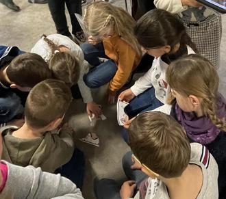 Die Schülerinnen und Schüler der Grundschule Bombogen während der Schnitzeljagd in der Stadtbücherei (Foto: Jennifer Schmitt).