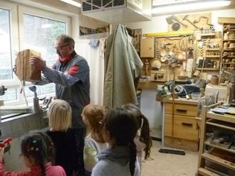 Anschließend folgte der Besuch in der Drechselwerkstatt. Hier zeigten Fritz Rauch und Christel Losen den Kindern anschaulich, welche Maschinen und Werkzeuge man zum Ausüben des Drechselhandwerks benötigt.