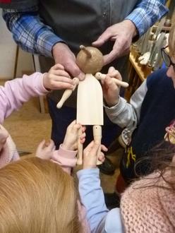 Nach einem Besuch des Theaterstückes „Pinocchio“ in Trier ist bei den Kindern die Idee entstanden, die Figur des Pinocchio aus Holz zu gestalten, da dieser ja von seinem Papa aus Holz geschnitzt wurde. Es folgten daraufhin weitere Besuche in der Drechselwerkstatt, wo die Körperrohlinge für die Figuren gesägt wurden. Pinocchio erhielt sogar von Fritz Rauch gedrechselte Arme und Beine.
