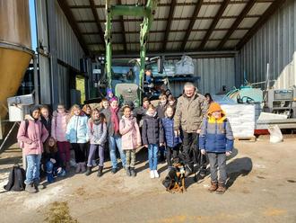 Am Bauernhof angekommen begrüßte Herr Mertes, der Besitzer, die Klasse. Er erzählte, dass er für seine Kühe Raps, Weizen und Mais anbaut. Dazu braucht er 240 Hektar Land, das er mit vier Traktoren und einem Mähdrescher bewirtschaftet.