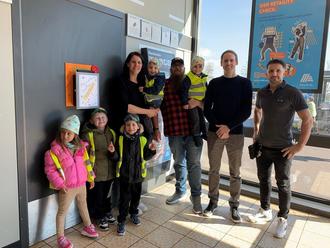 von rechts: Sergej Altmann (Marktleiter ALDI SÜD Wittlich), Daniel Scheibe (Regionalverkaufsleiter ALDI SÜD), Jens Lörsch und Susanne Clemens mit Kindern des Ev. Kindergarten Vitelliuspark (Foto: Privat).