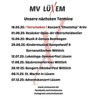 Das bereits für den 18.05.2025 angekündigte Konzert „Ghostship“ des Musikvereins Lüxem in der Weinbrunnenhalle in Kröv muss aus gesundheitlichen Gründen leider kurzfristig auf einen anderen Termin verschoben werden. Der neue Termin wird rechtzeitig über die Webseite www.mvluexem.de bzw. die Social-Media-Kanäle bekanntgegeben. Wir bitten um Verständnis.