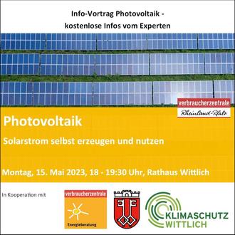 Der Vortrag „Photovoltaik auf dem Dach“ findet statt am Montag, den 15. Mai von 18 bis 19:30 Uhr im Rathaus der Stadt Wittlich (Schloßstraße 11, Saal Lieser). Die Teilnahme ist kostenlos. Um unverbindliche Anmeldung per Email an klimaschutz@stadt.wittlich.de wird gebeten.