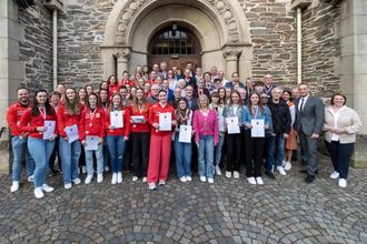 Bürgermeister Rodenkirch sprach dann auch den Sportlerinnen und Sportlern Lob, Dank und Anerkennung für ihre herausragenden sportlichen Leistungen des vergangenen Jahres aus, erfordern die Titelgewinne doch Trainingseinsatz, Fleiß, Ehrgeiz, Disziplin und Ausdauer. Durch die mit den Sporttreibenden geführten Interviews erhielten die Anwesenden Informationen zu den Sportarten (wie z. B. die Graduierungen/Gürtel bei Judo und JuJutsu), den Trainingsaufwand (der bis zu 6 Tagen je Woche reicht) und auch die weiteren sportlichen Ziele. Neben einer Urkunde wurde den Geehrten im Beisein der Beigeordneten der Stadt Wittlich Elfriede Meurer und Elfriede Marmann eine Medaille der Stadt Wittlich überreicht.