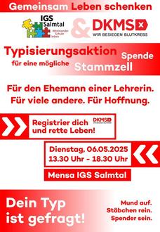 Aus diesem Anlass führt die Schule gemeinsam mit der DKMS eine Typisierungsaktion durch. Am 06.05.2025 haben alle Personen aus dem Umkreis im Alter zwischen 17 und 55 Jahren von 13:30 bis 18:30 Uhr die Möglichkeit, sich in der Mensa der IGS Salmtal zu registrieren.
