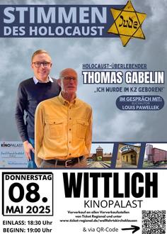 In Kooperation mit der Kath. Kirchengemeinde Klausen im Rahmen von „Kultur in der Wallfahrtskirche“, dem Emil-Frank-Institut Wittlich und dem Kinopalast Wittlich, findet am 8. Mai 2025 (19 Uhr), dem Tag des Kriegsendes (2. Weltkrieg), im Kinopalast Wittlich ein besonderer Multimedia-Vortrag und Gespräch, mit Holocaust-Überlebendem Thomas Gabelin und Buchautor Louis Pawellek, statt.