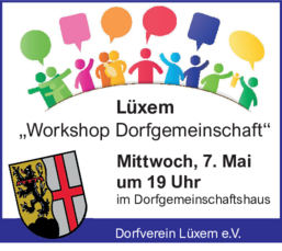 der "Dorfverein Lüxem e.V. “ hat es sich zur Aufgabe gemacht, das Leben im Ort attraktiver zu gestalten. Mit unserem „Workshop Dorfgemeinschaft“ möchten wir Menschen motivieren und begeistern, die örtliche Gemeinschaft mitzugestalten.