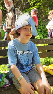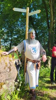 Hier erwartete Ritter Aki, alias Axel Lex, die Wanderer und insbesondere die mitwandernden Kinder staunten ob der historischen Rüstung und lauschten begeistert den Erzählungen des Ritters zu der Geschichte der Burgen und zum Mittelaltergeschehen auf dem Neuerburger Kopf.