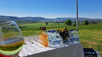 Mit Blick auf die Moselberge erfreuten sich die Teilnehmer an Streuselkuchen, rotbackigen Äpfeln und Sprudel und genossen Honigmet aus dem Liesertal.