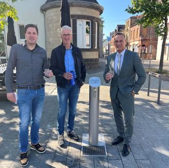 Inbetriebnahme des Trinkwasserbrunnen am Ottensteinplatz: V.l.n.r: Stellvertretender Werkleiter Martin Kurzweil, Jürgen Jakobs, technischer Angestellter bei den Stadtwerken und Bürgermeister Joachim Rodenkirch (Foto: Sebastian Klein).