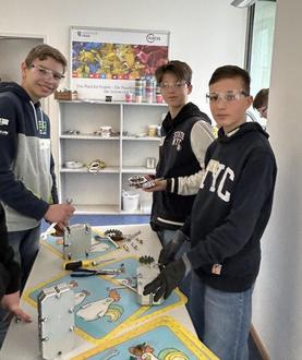 Dabei erfuhren die Jugendlichen nicht nur etwas über die unterschiedlichen Plastikarten und die damit verbundenen Probleme für die Umwelt, sondern erhielten auch Informationen über umweltfreundlichere Alternativen sowie Recycling-Möglichkeiten. Letzteres setzten die Schülerinnen und Schüler hoch motiviert dann selbst um, indem sie, unterstützt von den Studierenden, bestimmte Plastikarten maschinell zerkleinerten, einschmolzen und in neue Formen pressten. Dadurch stellten sie neue Lineale für den Schulalltag oder auch Knöpfe und Perlenschmuck her.