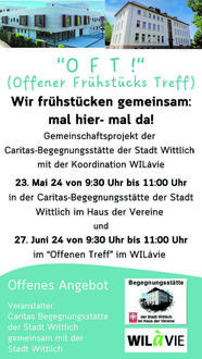 Am Donnerstag, dem 23. Mai 2024 wird der nächste offene Frühstücks Treff „OFT“ in der Begegnungsstätte in der Kasernenstraße 37 angeboten.