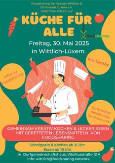 Am Freitag, 30. Mai findet ab 16 Uhr im Dorfgemeinschaftshaus in Wittlich-Lüxem zum ersten Mal die "Küche für Alle" statt. Dorfverein Lüxem e.V. und die foodsharing-Gruppe im Landkreis laden gemeinsam herzlich ein zum gemeinschaftlichen Kochen und Essen aus geretteten Lebensmitteln. Eingeladen sind ALLE, die Lust auf ein klimafreundliches Essen in Gesellschaft haben und sich über die