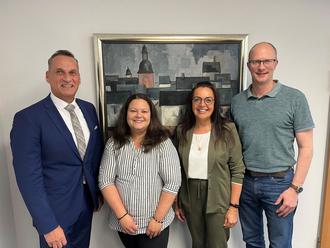 Bildunterschrift: Bürgermeister Joachim Rodenkirch begrüßte die neue Mitarbeiterin und wünschte ihr für ihre künftigen Aufgaben viel Erfolg. Den Wünschen schlossen sich die Personalratsvorsitzende Christiane Schmitz-Hayer (2.v.r.) sowie der Fachbereichsleiter I Jan Mußweiler (1.v.r.) gerne an (Foto: Sebastian Klein).