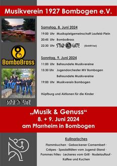 Der Musikverein 1927 Bombogen e. V. veranstaltet auch in diesem Jahr am 2. Juniwochenende 08. und 09. Juni sein Sommerfest Musik & Genuss im Pfarrgarten Alberostraße 10 in Bombogen.