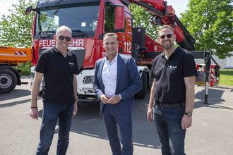 Bürgermeister Joachim Rodenkirch gratulierte Jörg Follmann (Vertrieb MAN) (links) und Alexander Heinrichs (Betriebsleiter MAN Servicebetrieb) (rechts) zum 50 jährigen Bestehen des MAN Servicebetrieb in Wittlich (Foto: MAN Wittlich).