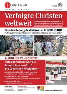 Ausstellung vom 1. – 29. Juni „Verfolgte Christen in der Welt“ Christsein war noch nie so gefährlich wie heute. Obwohl das Recht auf Religionsfreiheit als grundlegendes Menschenrecht international anerkannt ist, wird es in der Praxis in vielen Regionen der Erde missachtet. In der Ausstellung „VERFOLGTE CHRISTEN WELTWEIT“ von KIRCHE IN NOT werden einige Brennpunktländer in Porträts und mit zahlreichen Fotos vorgestellt. Die Ausstellung wird vom 1.06. bis zum 29.06.25 in der Autobahn- und Radwegekirche St. Paul zu Gast sein.