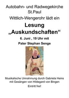 Freitag, 6. Juni Lesung „Auskundschaften“ mit Pater Stephan Senge Der Himmeroder Pater Stephan liest aus seinem neusten Werk. Die musikalische Umrahmung gestaltet die Sängerin Gabriela Heins mit Liedern der Hl. Hildegard von Bingen. Der Zisterzienser Mönch aus Himmerod, begibt sich auf eine Spurensuche nach Jesus. Auf seinem Weg kundschaftet er nach Schätzen, Brunnen und Türen, um ihre Geheimnisse zu entdecken. Senges Bücher sind immer eine spirituelle Spurensuche. Es geht um Stellungnahme, besser: Einüben, vertraut werden mit den Menschen um uns herum.