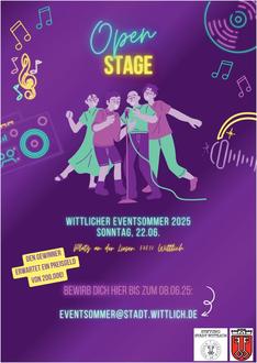 Die zweite Open Stage des Wittlicher Eventsommers richtet sich an alle, die schon lange davon träumen, ihr Talent einem Live-Publikum zu zeigen, aber bislang noch keine Gelegenheit dazu hatten. Ob Rock, Akustik, Country, Pop oder Reggae – bei uns ist alles erlaubt, was begeistert!