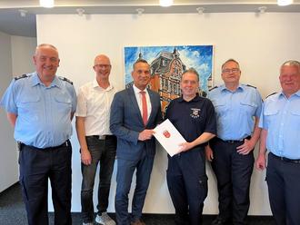 Bürgermeister Joachim Rodenkirch (3.v.l.) überreicht Thomas Lex (3.v.r.) die Ernennungsurkunde zum Einheitsführer Standort Lüxem im Besein von v.l.n.r.: Wehrleiter Christian Vollmer, Fachbereichsleiter Jan Mußweiler und stellvertretende Wehrleiter Martin Schmidt und Stephan Monzel (Foto: Birgit Rensch).