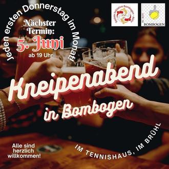 Zusammen mit der Initiative "Bombogen Aktiv" veranstaltet der Tennisclub Rot-Weiß Bombogen im Clubhaus Im Brühl am Donnerstag, 05.06.2025, ab 19 Uhr den nächsten Kneipenabend. Alle Bewohner aus Bombogen und den umliegenden Ortschaften sind herzlich willkommen! Genießt einen geselligen Abend mit erfrischenden Getränken und netten Gesprächen.